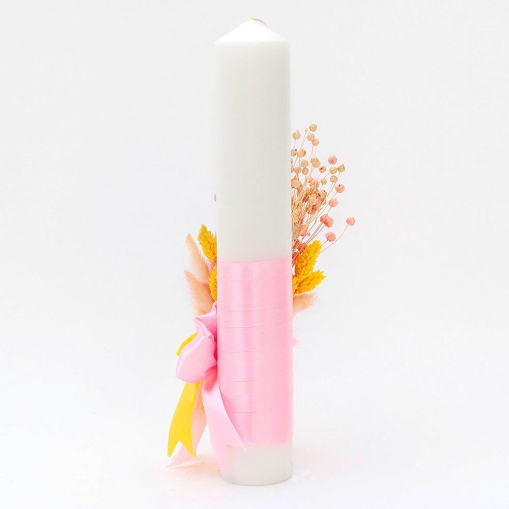 Lumanare botez cu flori uscate si spice de grau, Minnie, Roz, 35×6 cm