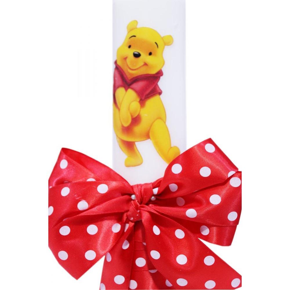 Lumanare botez cu imprimeu Winnie-The-Pooh, funda si panglica rosie cu buline – 30×5 cm