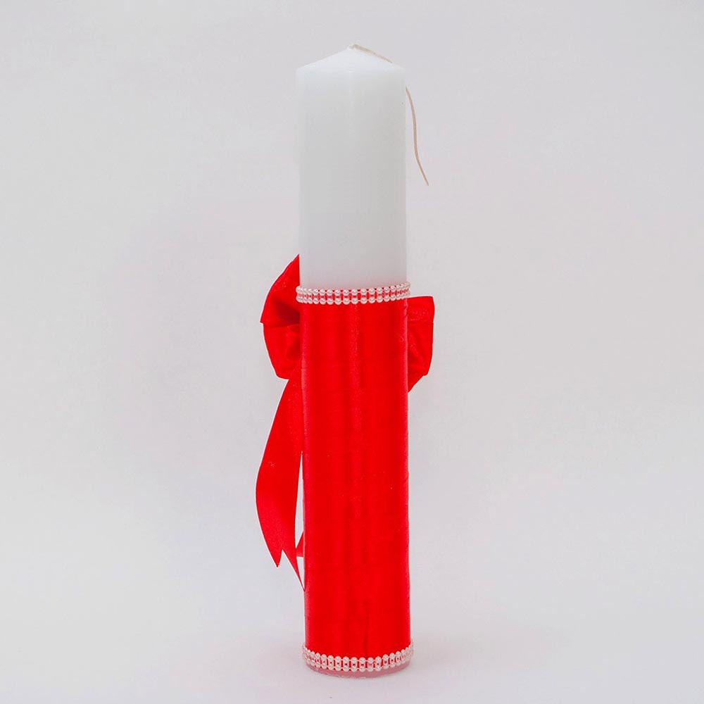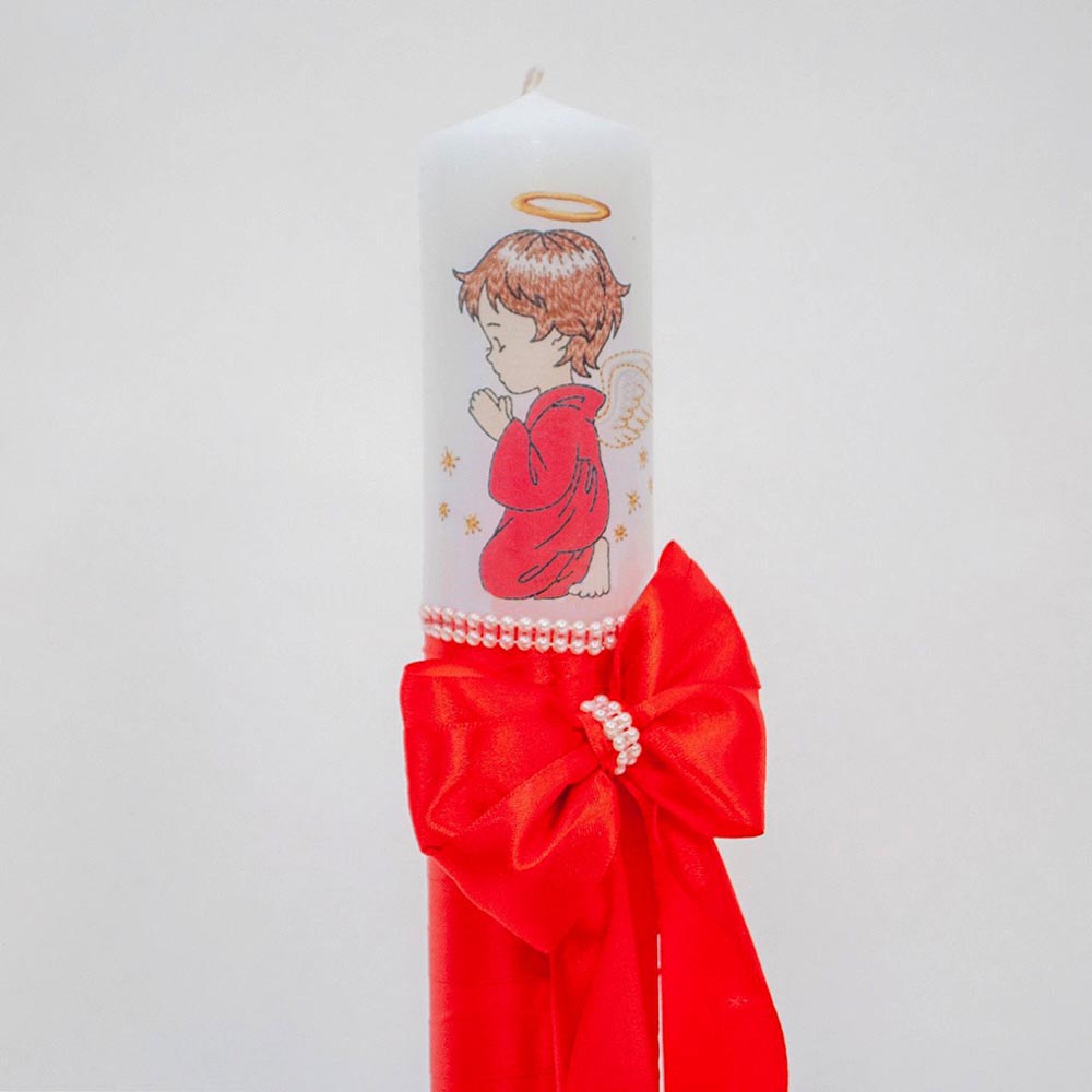 Lumanare botez cu panglica, funda si margele – Ingeras, Rosu, 35×5 cm