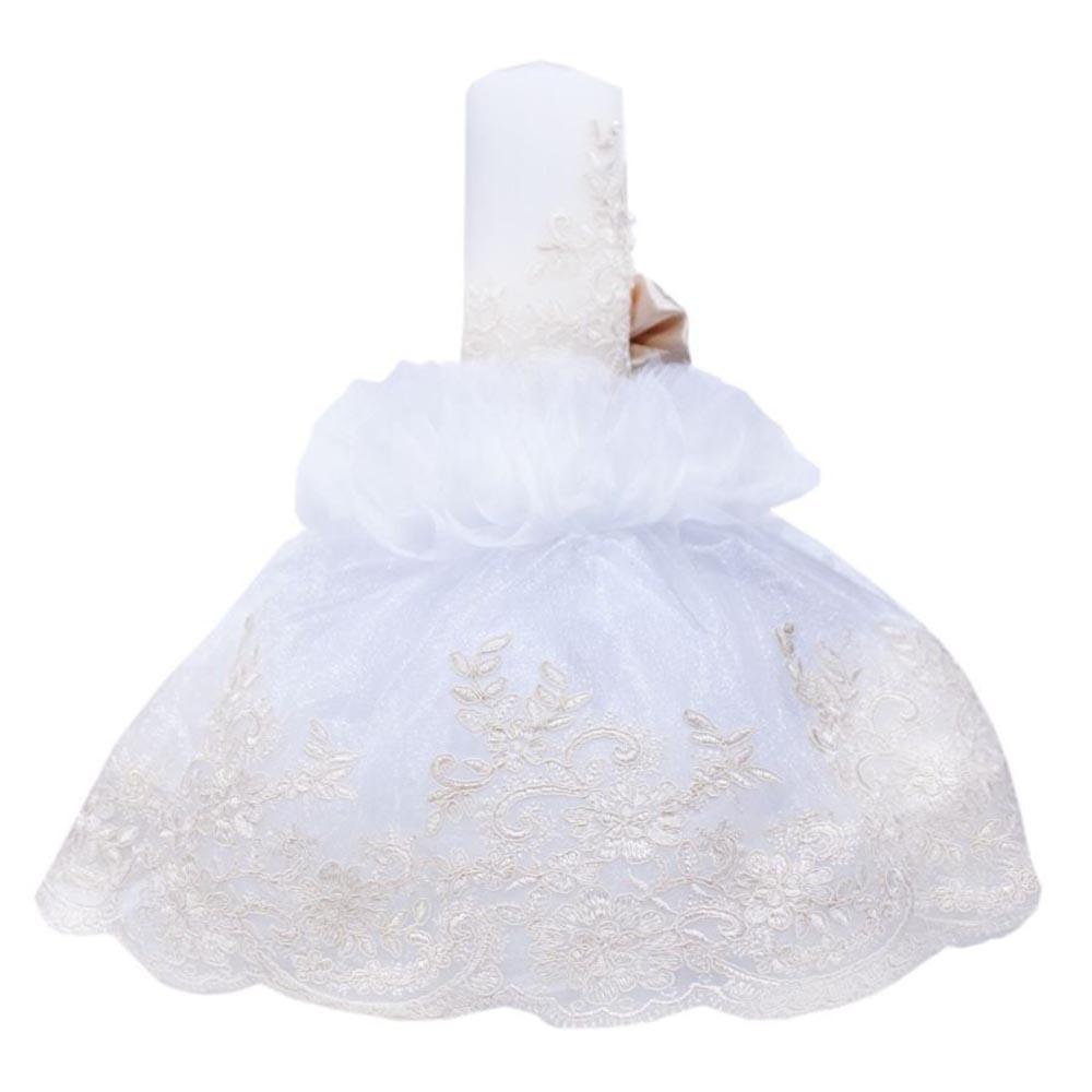 Lumanare botez cu tulle alb-stralucitor, funda si broderie – Bej – 45×7 cm