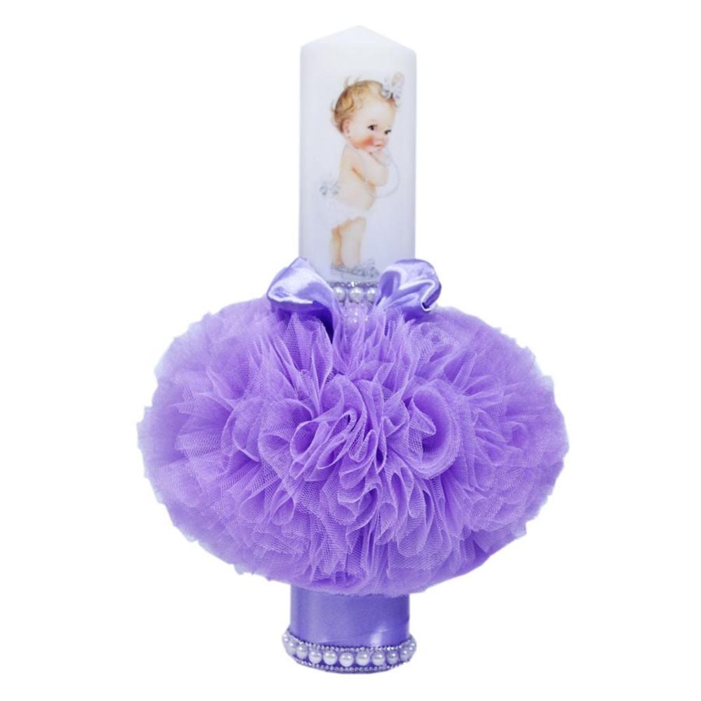 - Design Elegant: Lumanarea este decorată cu tulle mov delicat și perle, conferindu-i un aspect sofisticat, perfect pentru o mică prințesă.