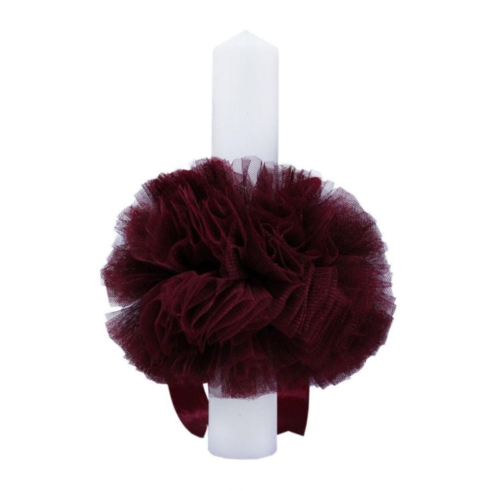 Lumanare botez cu tulle visiniu si funda – Cu mult drag de la Nasi – 30×5 cm