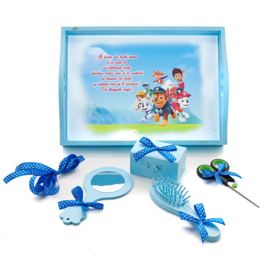 Tavita mot cu 6 piese bleu si fundite albastru electric cu buline – Patrula Catelusilor 35×20 cm TMB06