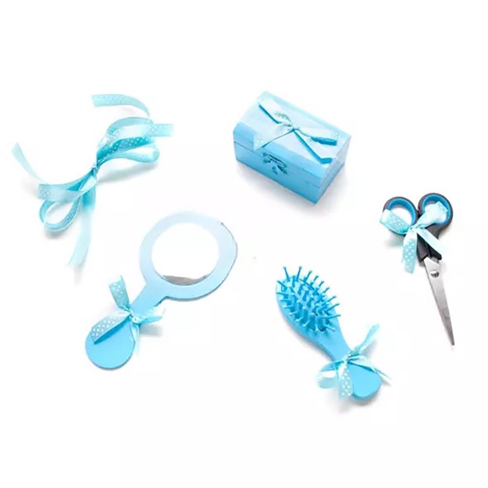 - Set Complet: Include toate uneltele necesare pentru tăierea moțului: foarfecă, perie de păr, oglindă, cutiuță pentru păstrarea șuviței și fundiță.