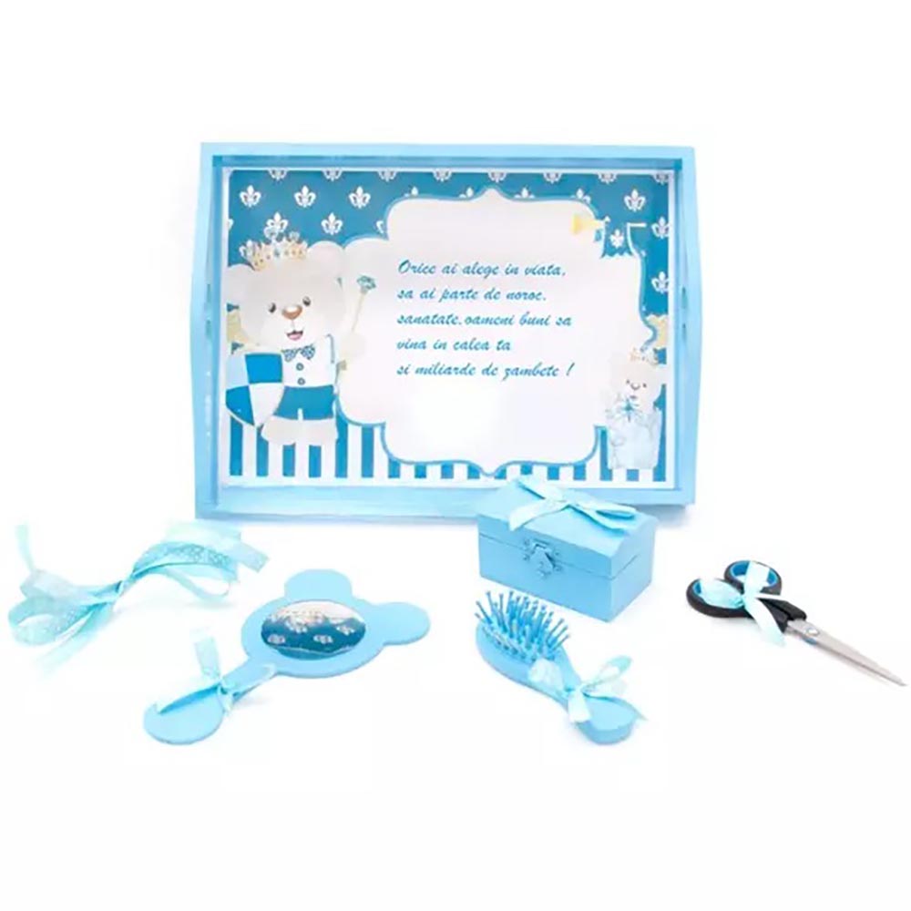 Descoperă Tavita mot cu 6 piese cu fundite bleu cu buline – Ursuletul Rege – Albastru 35×20 cm TMB15, un set elegant și practic, perfect pentru a marca un moment special din viața copilului tău. Această tăviță nu este doar un obiect decorativ, ci și un simbol al tradiției, oferindu-ți tot ce ai nevoie pentru o ceremonie de tăiere a moțului. Alege să aduci un strop de magie și noroc în viața micuțului tău!
