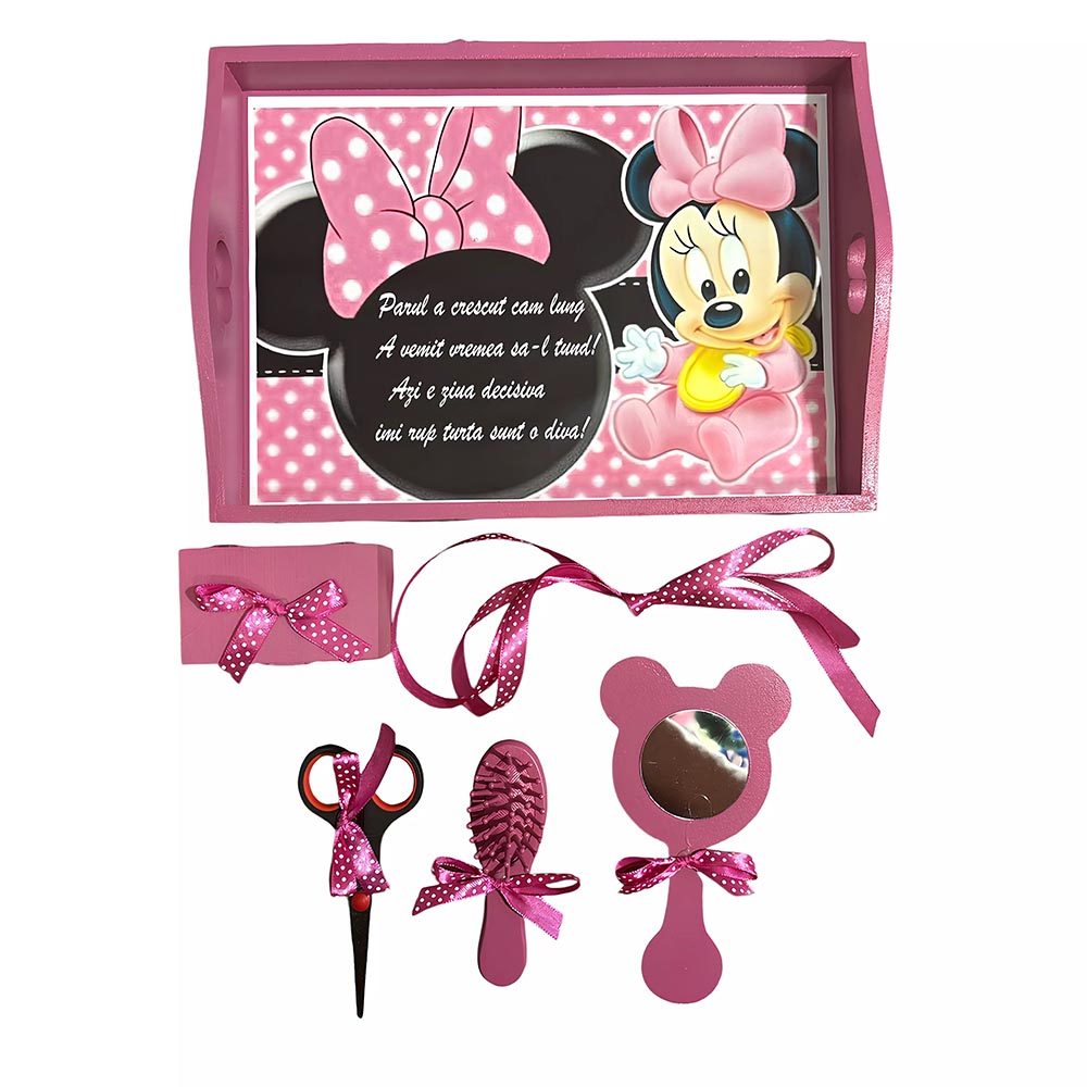 • Set Complet: Tăvița este însoțită de 6 piese esențiale, inclusiv foarfecă, perie de păr, oglindă, cutiuță pentru păstrarea șuviței de păr și fundiță, toate contribuind la un ritual plin de semnificație.
