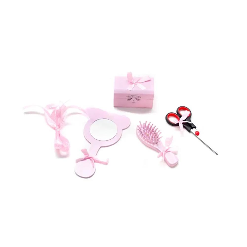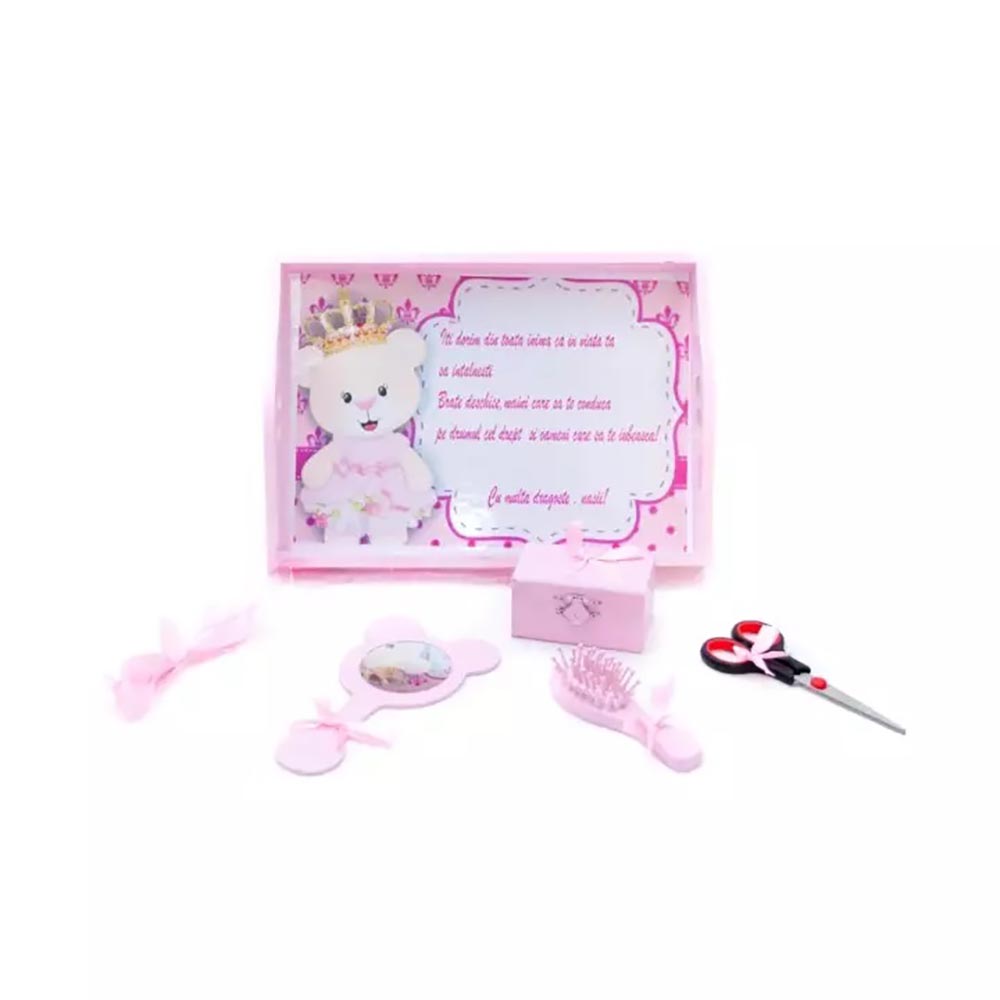 • Setul include: Tăvița, foarfecă, perie de păr, oglindă, cutiuță pentru păstrarea șuviței de păr, fundiță pentru legarea șuviței de păr.