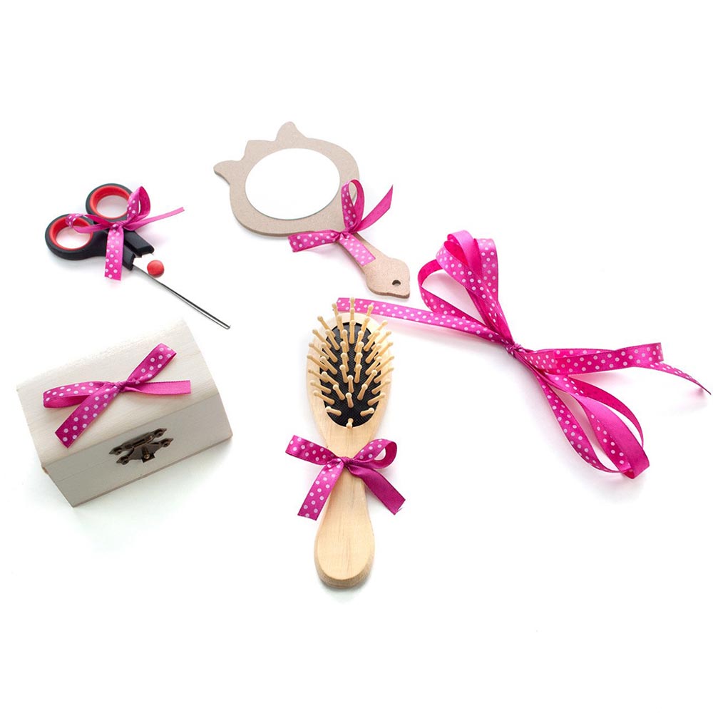 - Conținutul Setului: Tăviță, foarfecă, perie de păr, oglindă, cutiuță pentru păstrarea șuviței de păr, fundiță