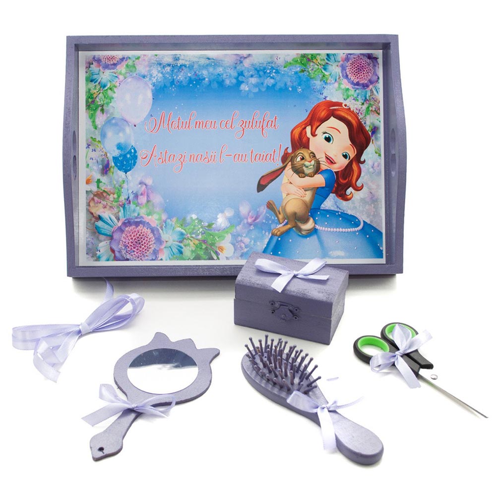 - Compus din: Tăviță, foarfecă, perie de păr, oglindă, cutiuță pentru păstrarea șuviței de păr, fundiță