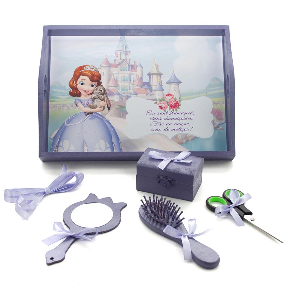 Fă din fiecare moment special o amintire de neuitat cu Tavita turta cu 6 piese si fundite, Mov Printesa Sofia -35×20 cm TTF18!