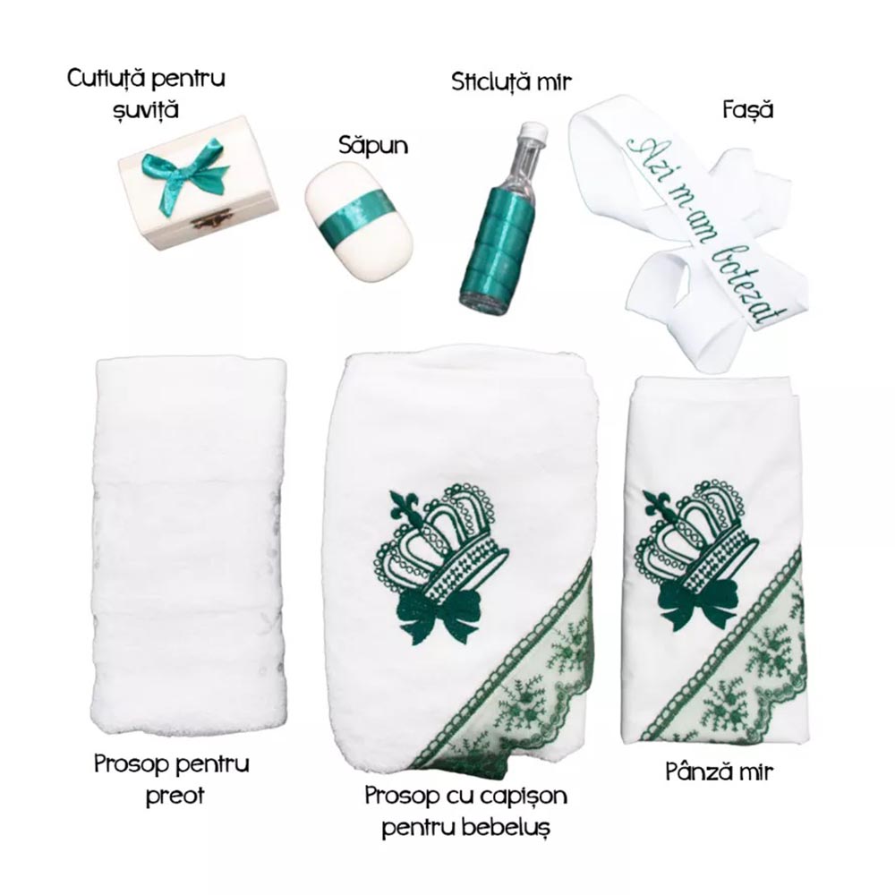 Trusou Botez 7 Piese Personalizat cu Broderie, Verde, Coroana Regala
